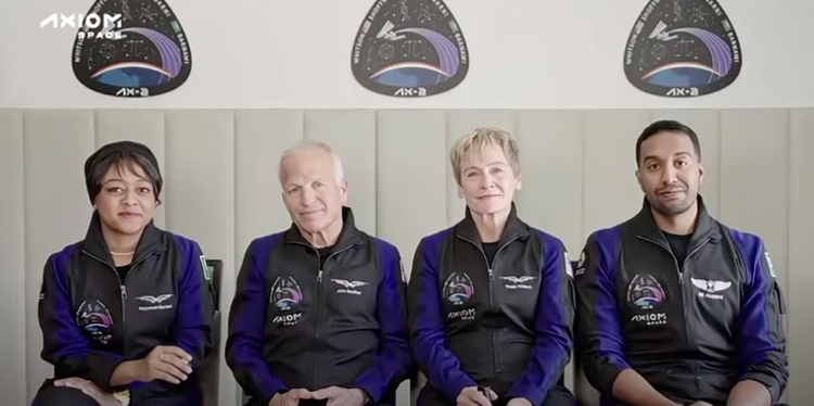 नासाच्या Axiom -2 मोहिमेतील सौदी अंतराळवीर Rayyanah Barnawiअंतराळवीर John Soffnerअंतराळवीर Peggy Whitson आणि अंतराळवीर Ali Alqarni जाण्याआधी पत्रकारांशी संवाद साधताना -फोटो नासा संस्था